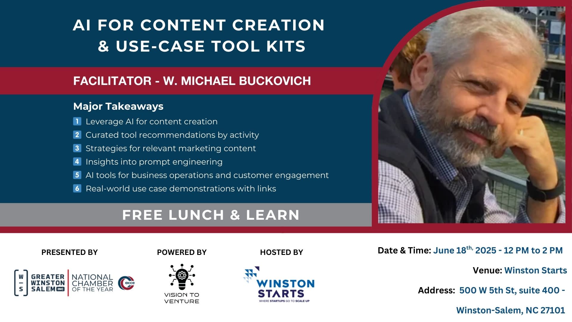 Join us for a complimentary Lunch & Learn workshop “AI for Content Creation & Use-Case Tool Kits” on Wednesday, June 18th, from 12:00 PM to 2:00 PM at Winston Starts - 500 W 5th St. - Winston-Salem - NC.