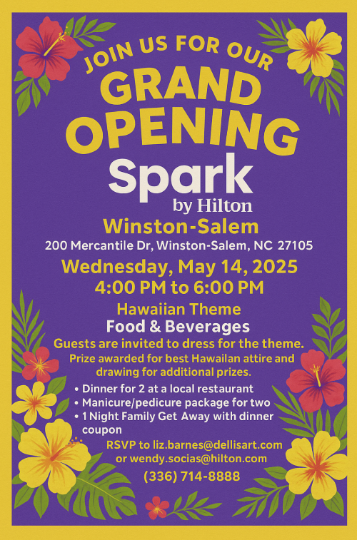 Join us as we celebrate the grand opening of Spark by Hilton in Winston-Salem with a Hawaiian-themed open house and ribbon cutting ceremony. Enjoy a full spread of food, adult beverages, and giveaways. Grab your favorite Hawaiian shirt and join us for a wonderful celebration, networking, and getting to know the Spark by Hilton team as we celebrate the growth of our business community!