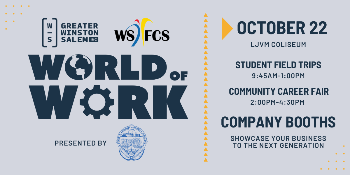 Welcome to the World of Work! This event will welcome more than 2,500 Winston-Salem/Forsyth County 10th graders to explore career possibilities across a variety of industries. Students will have the opportunity to interact with businesses and educational institutions to learn more about the careers that interest them and how to get there. 10th grader tours will be held from 9:45 AM - 1:00 PM.